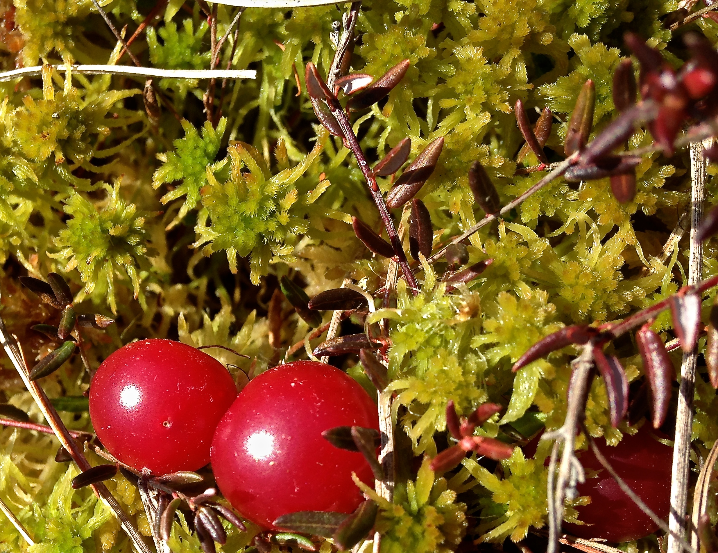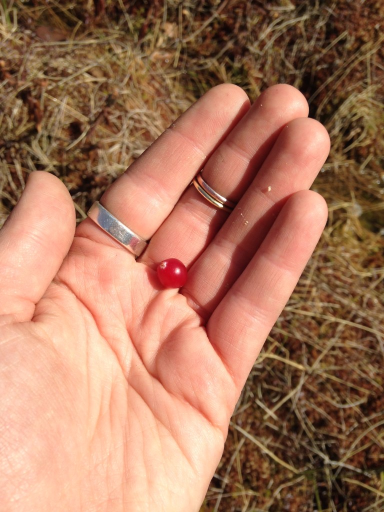 Last season’s cranberry fruit (still taste good) among the bog characterizing plant, Sphagnum moss. Sphagnum moss has cool antibiotic properties and was used for bandaging in WWII (in England and other places with peat) when supplies ran low. Also, the water you can squeeze out of the moss is okay to drink!